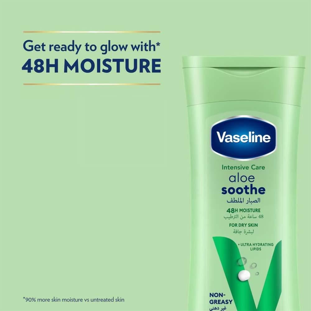 Vaseline Intensive Care Soothing Lotion with Aloe Vera contains Aloe Vera known to soothe and soothe dry, irritated skin and absorbs quickly without leaving a greasy feeling. Suitable fordry skin, itchy skin and dry, sunburned skin. Benefits and features It contains small drops of Vaseline Jelly to give you complete care. Aloe Vera soothes irritated skin and moisturizes dry skin for optimal softness. Ideal for daily use, it nourishes the skin, maintains its balance, and gives it a gentle reflection of light. Leaves your skin deeply soft.