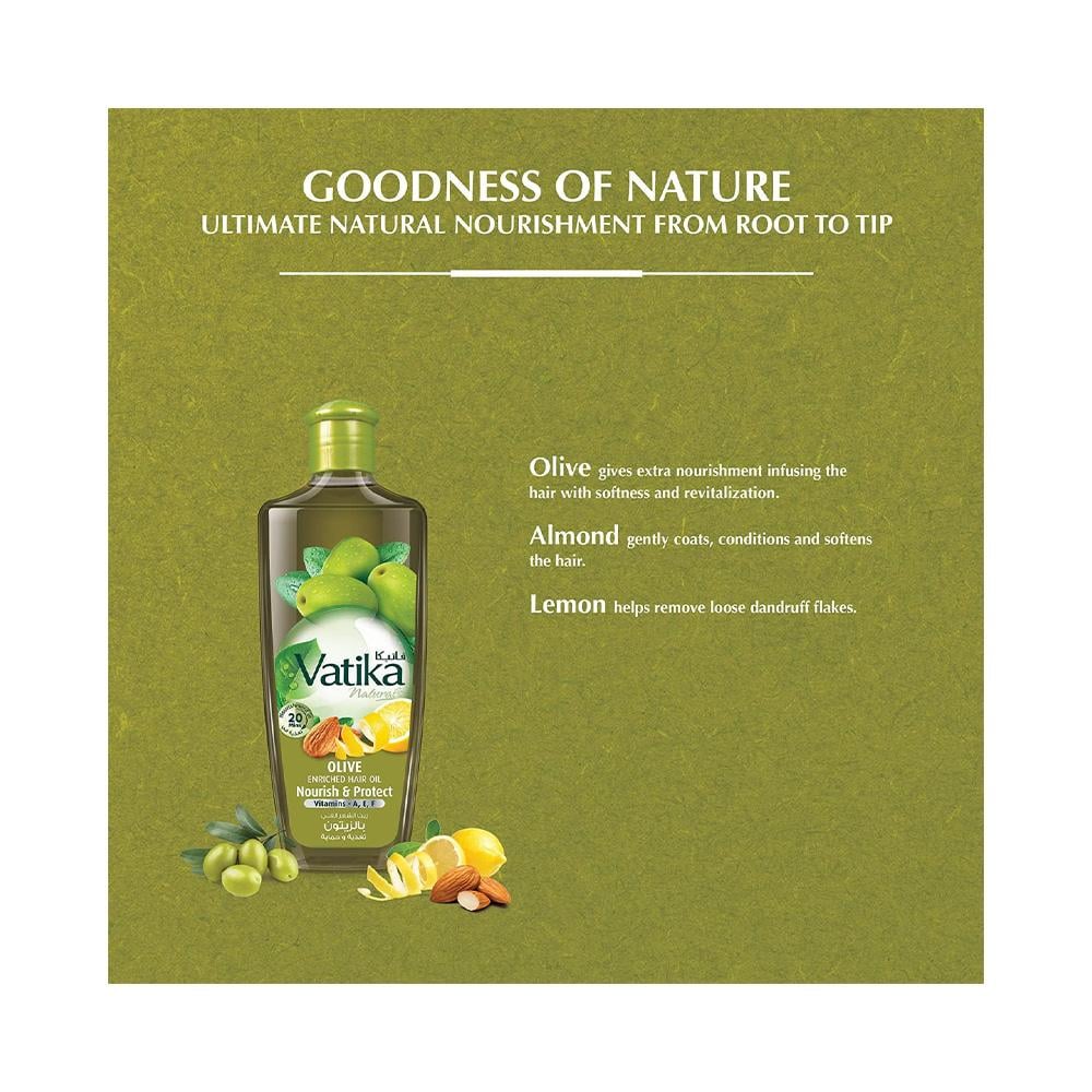 Vatika Olive Oil contains original olive oil that retains moisture and prevents dry scalp. The presence of almond and aloe vera extracts stimulates hair growth and prevents hair loss. Lemon extracts help remove excess oil buildup on the scalp. Vatika Olive Oil, which is known for its great benefits for hair, nourishes and moisturizes hair from roots to ends and helps increase hair density. It gives hair a wonderful shine that lasts for a long time. It also adds a layer to the hair that protects it from the sun's rays that cause dryness and damage to the hair. Benefits and features Vatika Oil helps moisturize dry and brittle hair sufficiently A small amount of Vatika Olive Oil covers the entire hair and massages the scalp with it to get the required hydration It works to protect hair from falling out The oil contains a group of vitamins and elements that care for and nourish the hair Vatika Oil maintains the natural keratin in the hair Vatika Olive Oil restores the hair to its original healthy nature