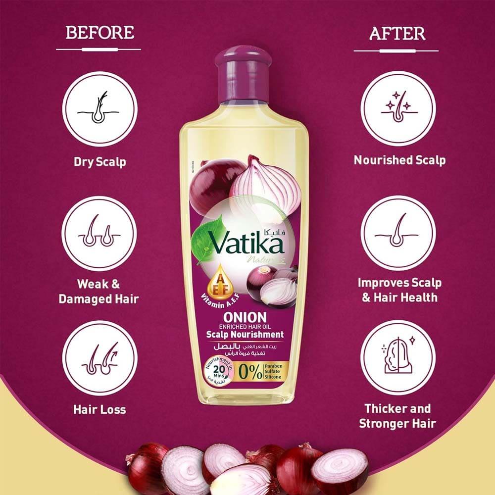 of Vatika Onion Enriched Hair Oil Promotes Hair Growth Onions contain compounds that enhance blood circulation in the scalp, which helps stimulate healthy hair growth. ๐ŸŒฑ Strengthens and Reduces Hair Loss It helps strengthen hair follicles from the roots, effectively reducing hair loss and enhancing hair thickness. ๐Ÿ’ช Comprehensive Scalp Nourishment Provides essential nutrients to the scalp, improving its health and reducing irritation and dryness. ๐Ÿ’†โ€โ™€๏ธ Shine and Vitality Gives hair a natural shine and vitality thanks to its deep nourishment. Natural and Safe Ingredients It contains natural ingredients such as onion extract, making it safe for regular use. ๐ŸŒฟ Moisturizing and Preventing Breakage Helps moisturize hair and prevent breakage and split ends. ๐Ÿ’ง Anti-Dandruff Helps reduce dandruff thanks to its antibacterial and antifungal properties. ๐Ÿšซ Treats Split Ends Thanks to its nourishing formula, it helps treat split ends. โœ‚๏ธ Ease of Use Can be easily used as part of your hair care routine. ๐Ÿงด Light and Refreshing Fragrance Features a light and refreshing fragrance that doesn't overwhelm the senses, for a pleasant experience. ๐ŸŒธ ๐Ÿงด