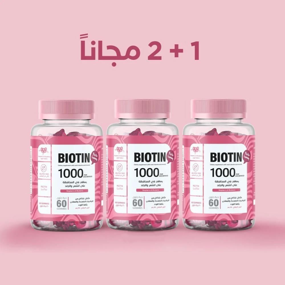 Promotes hair growth and reduces hair loss, giving you thicker, healthier, and stronger hair. Contributes to nourishing the skin from within, giving it a fresher, more vibrant appearance. Helps strengthen brittle nails and prevent breakage, leaving them stronger and more beautiful. It comes in the form of delicious berry-flavored gummies, making it easy and enjoyable to use. Contains 10,000 mcg of biotin to effectively support healthy hair, skin, and nails. It is gelatin-free, making it suitable for those on specific diets. It is formulated without artificial preservatives or colors. Directions Take one or two biotin gelatin tablets daily, or as directed by a physician. Be sure to chew thoroughly before swallowing.