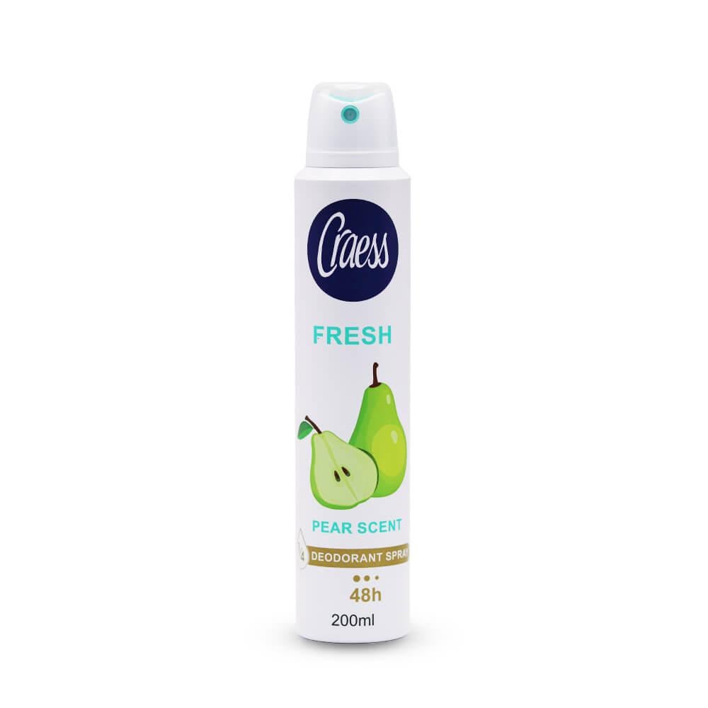 Craess Deodorant Spray with Pear Scent provides long-lasting freshness and effective 48-hour protection against sweat and odor. Its refreshing pear fragrance leaves you feeling clean and revitalized throughout the day. This deodorant is designed for all-day comfort, offering a balance of fresh scent and gentle care for your skin. Benefits and features Provides up to 48 hours of odor and sweat protection. Keeps skin fresh and clean with a pleasant pear fragrance. Non-irritating and gentle on the skin, suitable for everyday use. Quick-drying formula without leaving stains on clothes.