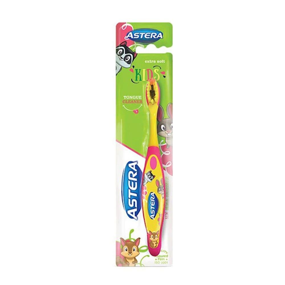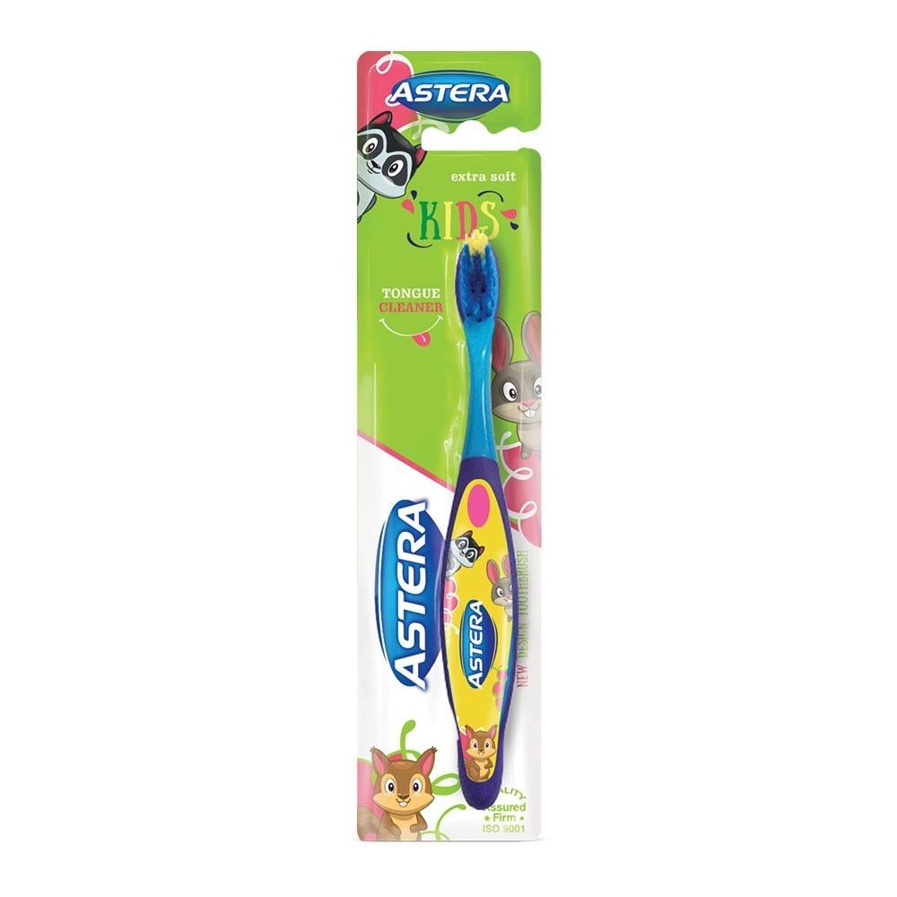 The Astera Kids toothbrush features an ergonomic design with a non-slip handle, specially designed for a child's hand. Its angled bristles at varying heights help clean even hard-to-reach areas between teeth. It also includes a tongue cleaner.