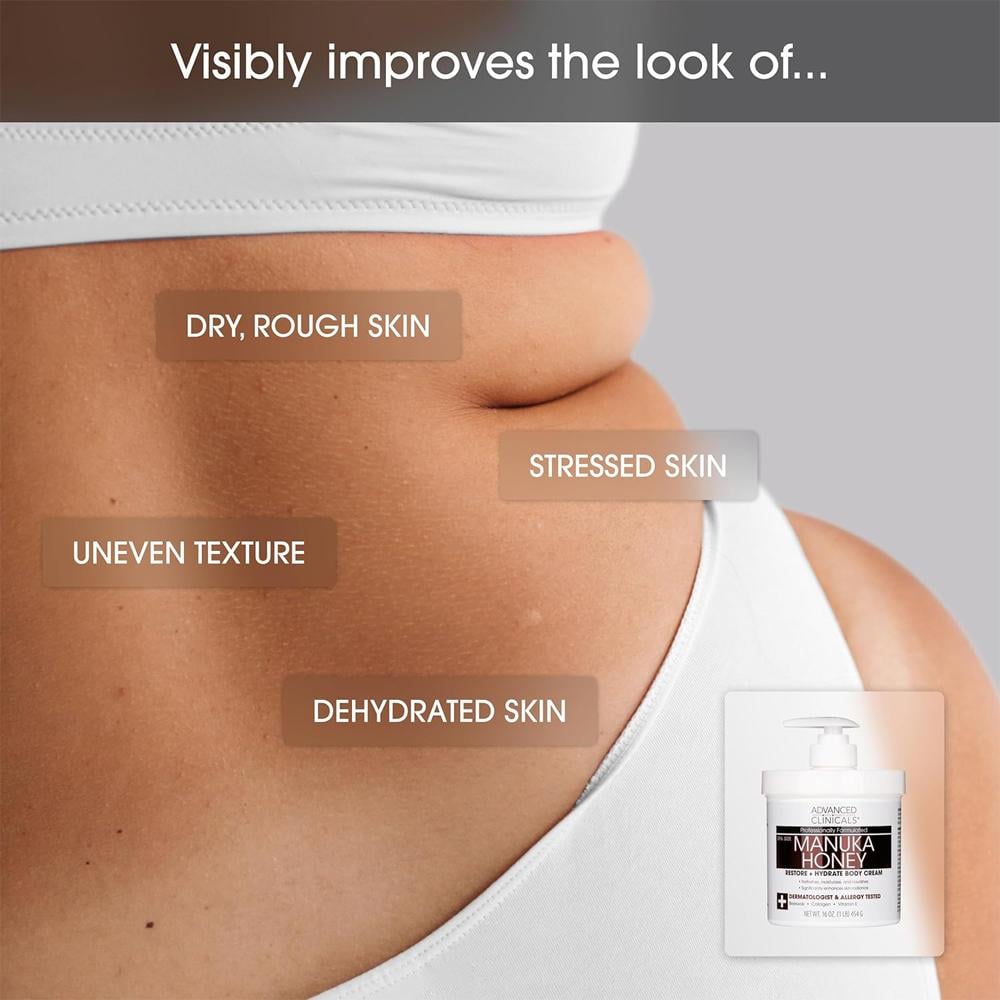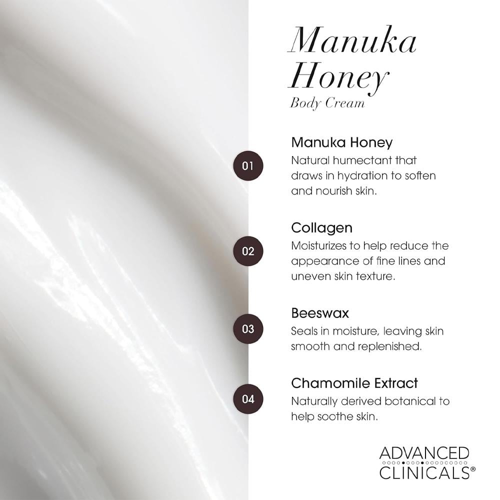Advanced Clinicals Manuka Honey Restore + Hydrate Body Cream – 454 gm Looking for a large-size cream that hydrates and renews dry skin?